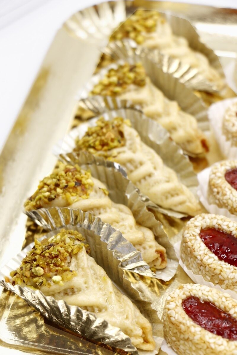 * CORNES DE GAZELLES / TCHARAK : une pâte sablée qui renferme une farce aux amandes parfumée légèrement à la cannelle et à la fleur d’oranger, façonnée à la main en forme de corne de gazelle recouverte de sucre glace.