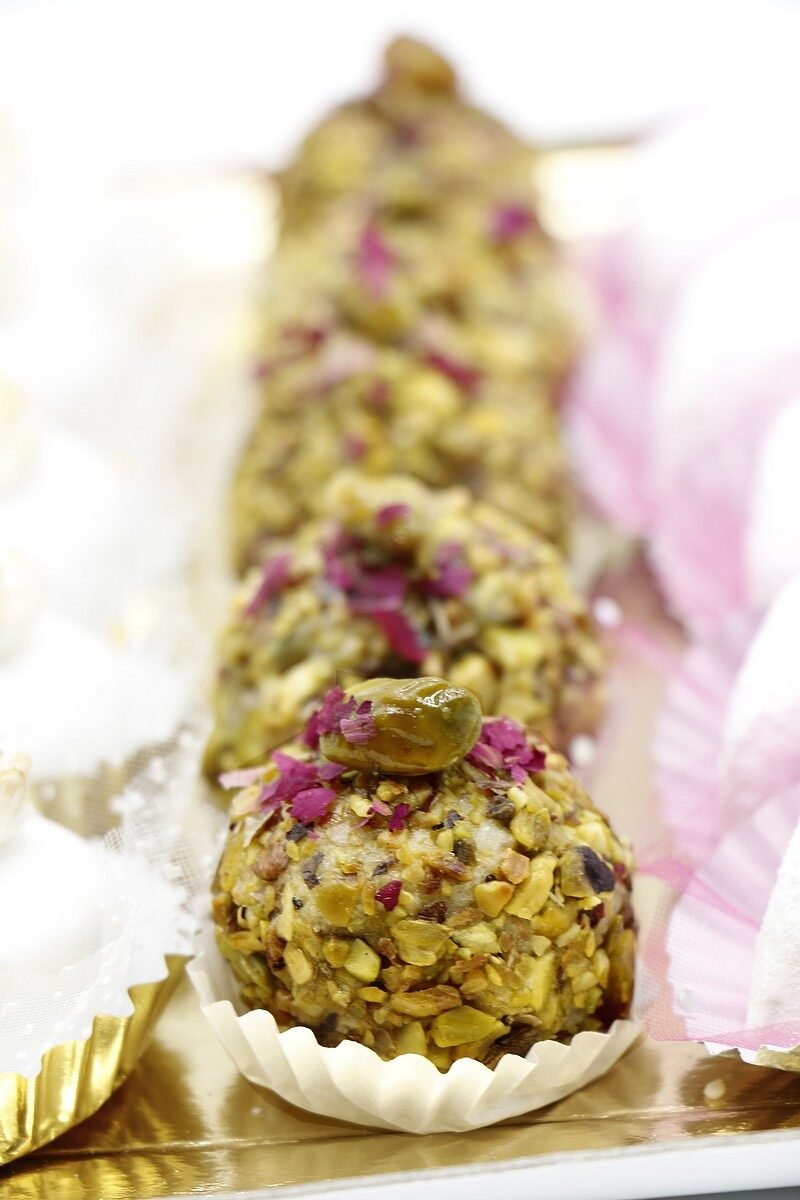 * BOULES PISTACHES : appelées « Mchewek El Bey », une boule de pâte d’amandes farcie de pistaches, enrobées de pistaches concassées, décorée de pétales de roses et d’une pointe de miel.