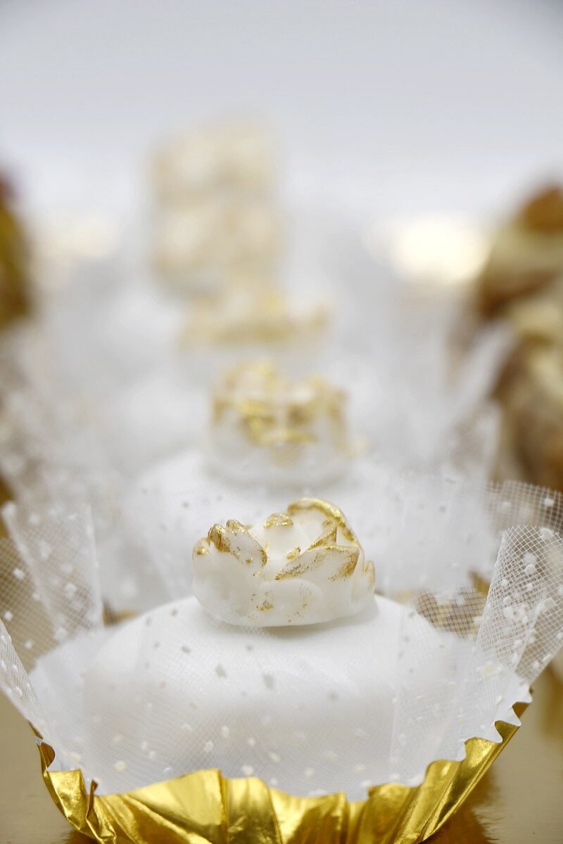 * MKHABEZ AUX NOISETTES : (sans gluten) un biscuit à base d’amandes et de noisettes parfumé au praliné noisettes maison enrobé d’un glaçage royal citron et fleur d’oranger, surmonté d’une décoration à base de pâte à sucre réalisée à la main.